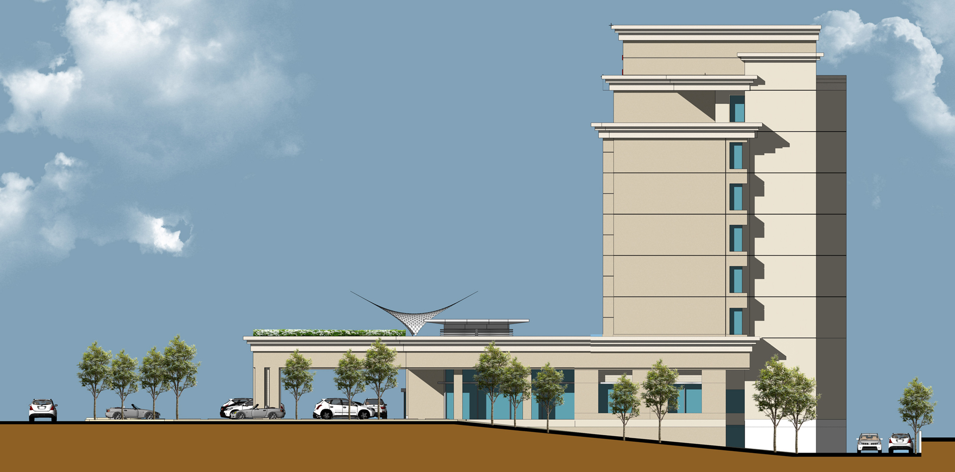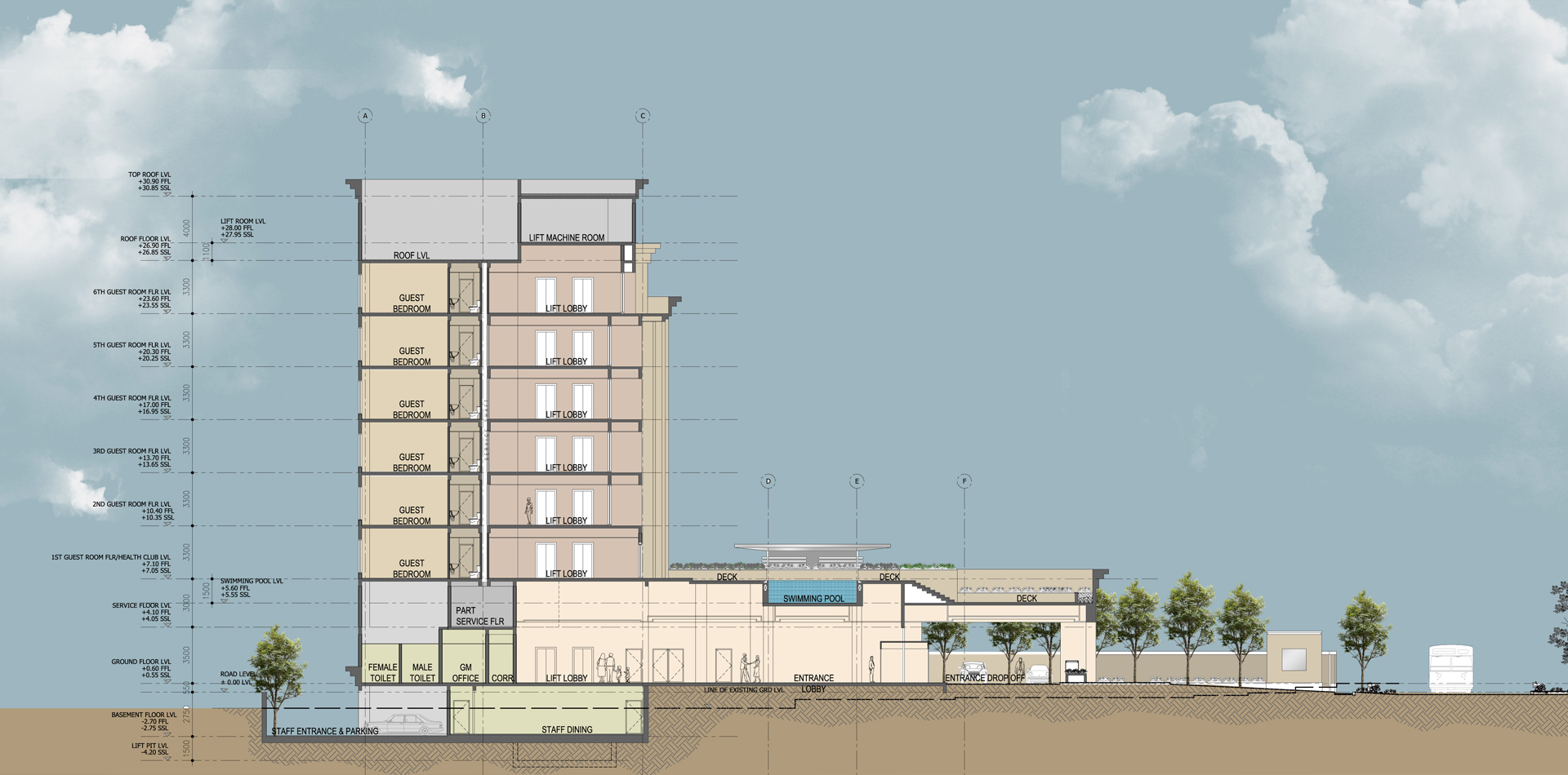 Designed to meet the entire brief as per the Hilton Garden Inn guidelines. The ground floor is designed with a grand entrance porch leading on to the grand lobby with reception & open restaurant. Pool & health club facilites are at the 1st floor. Rooms are typical 33sqm as per Hilton Garden Inn’s standards.