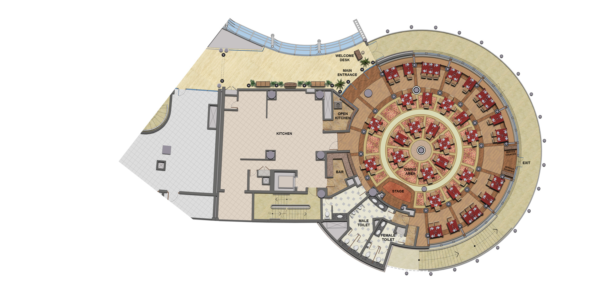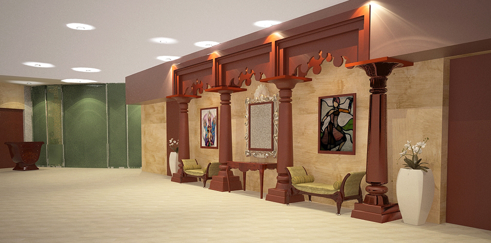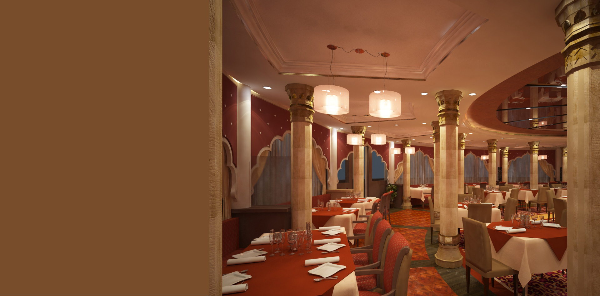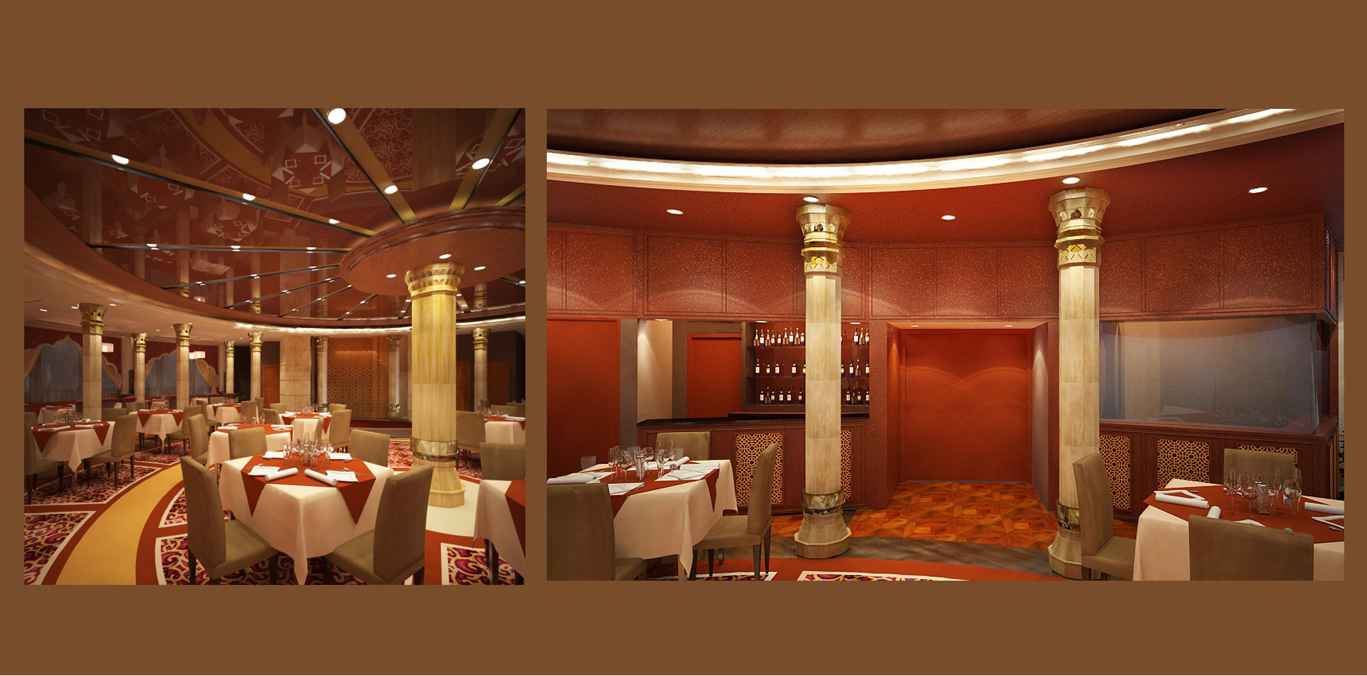 The project involved the refurbishment of an existing Arabic restaurant to a classical themed Indian Restaurant. Due to restricted budget the clients brief was to achieve the required transformation with minimal refurbishment. Minor modifications were made to the layout to increase the seating efficiency without affecting the area of the open kitchen and bar. Major alterations were achieved by theming the existing columns to the Indian style in keeping with the restaurant cuisine.