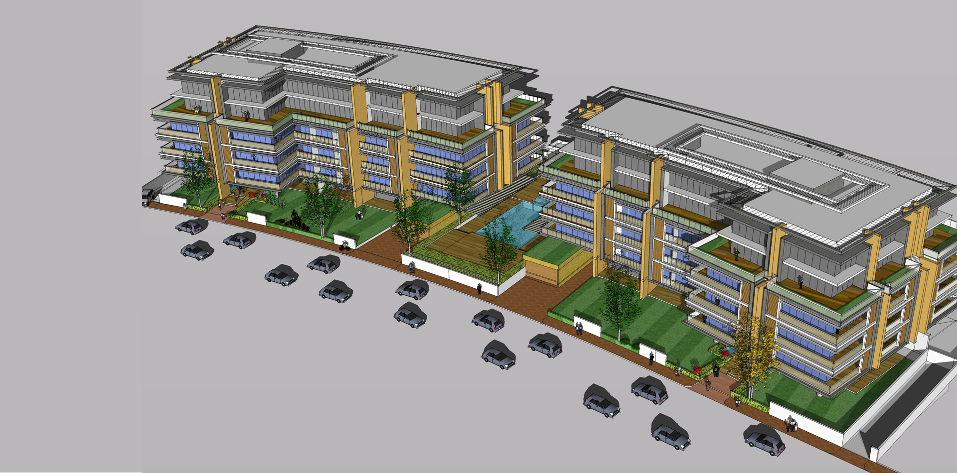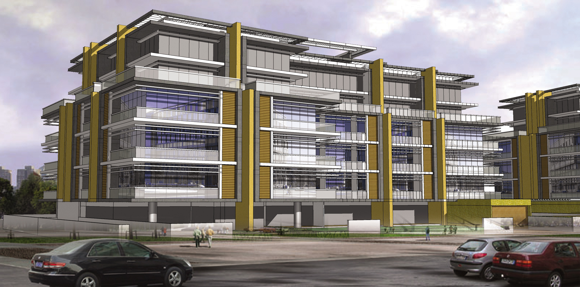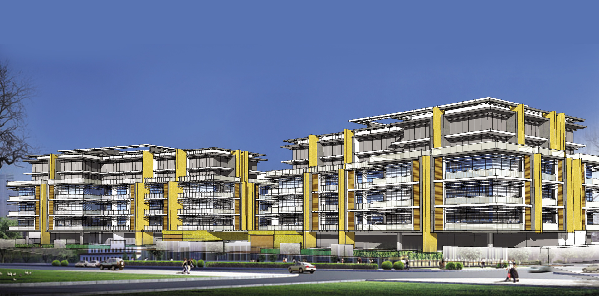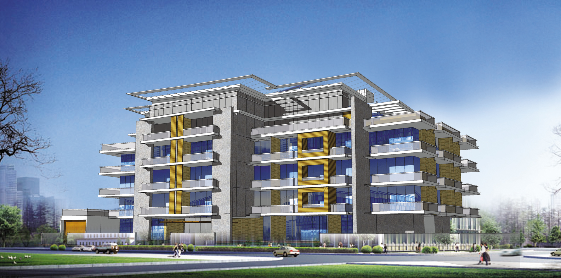 B+G+6 residential apartment buildings located in the Residential City of DWC. The design involved standard apartment units with balconies or gardens on the lower levels and duplex loft apartments with open terraces at the top level. Infinity Swimming pool and health club facilities provided at the ground level.