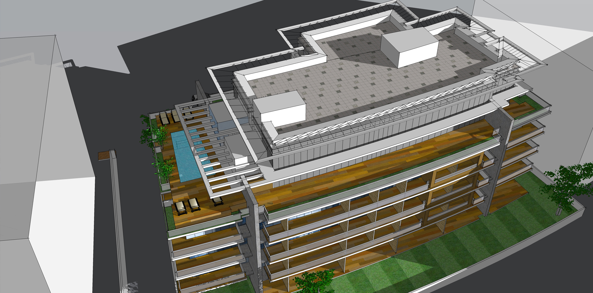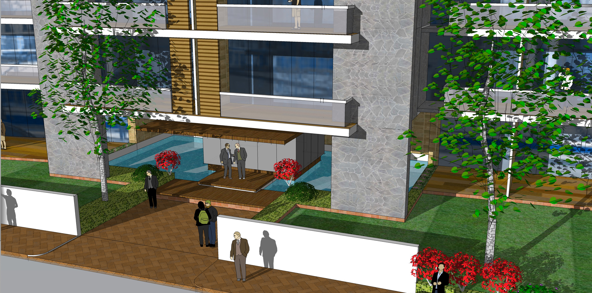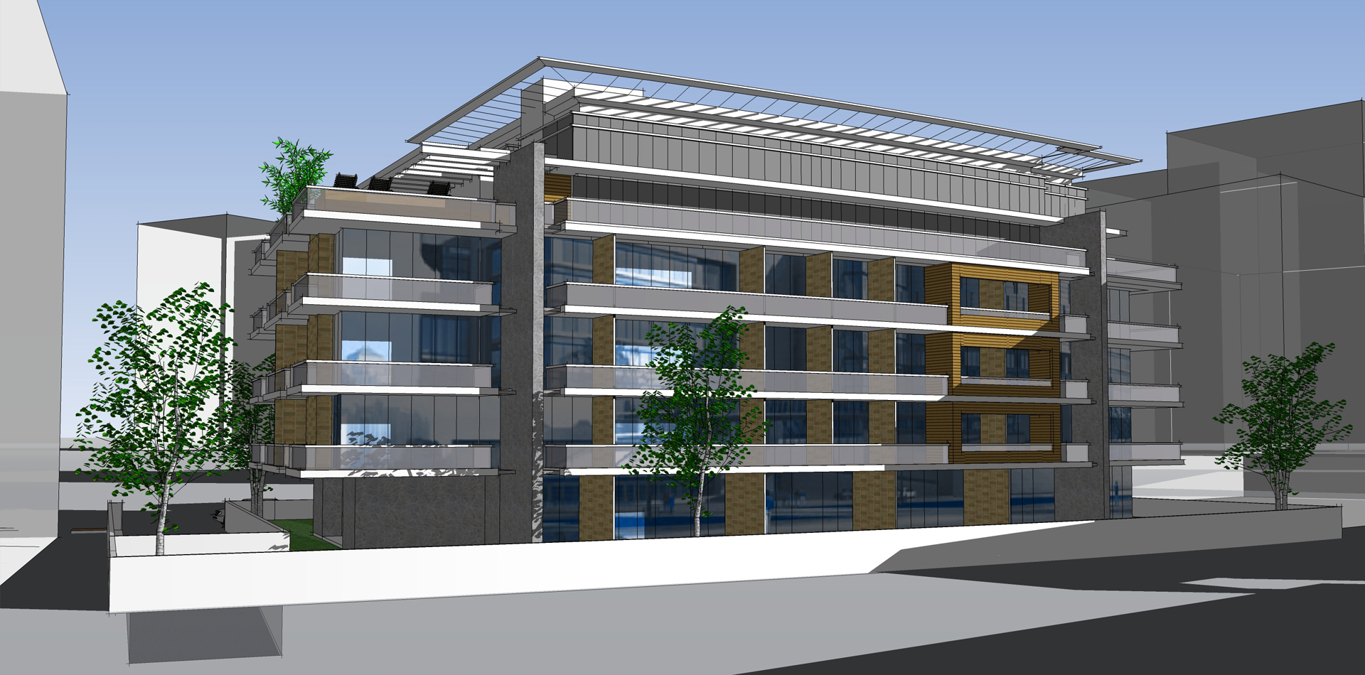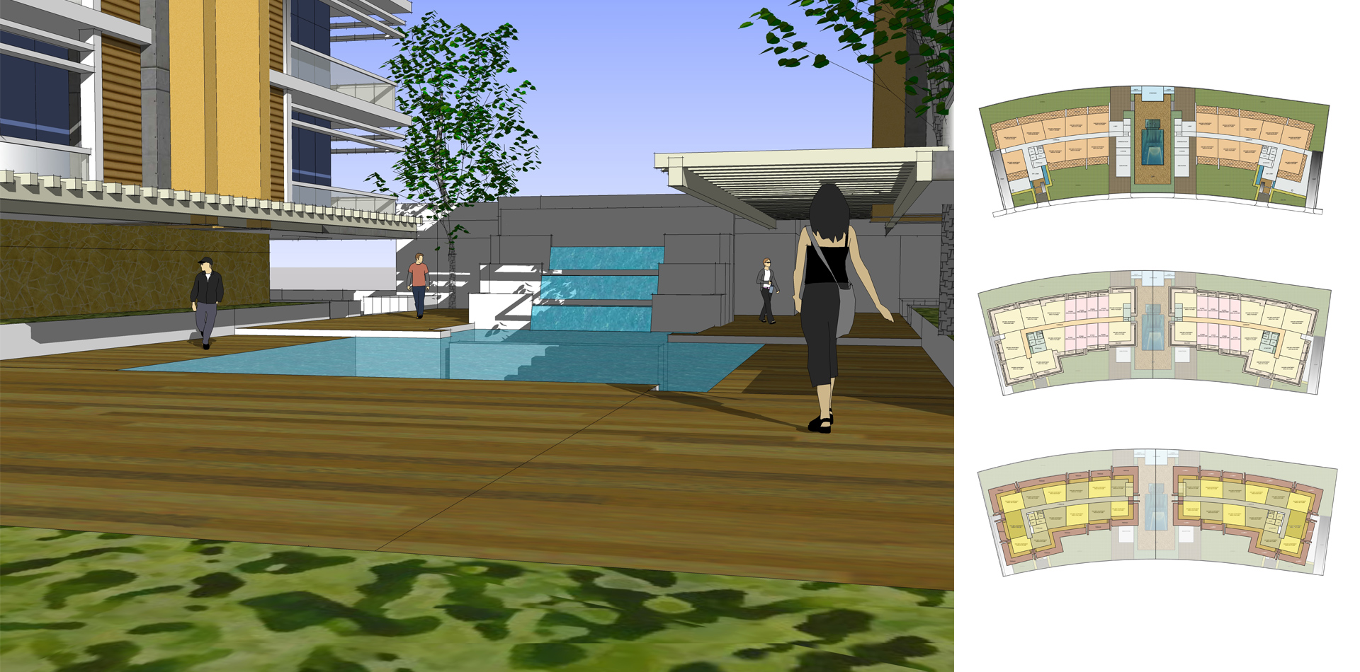 B+G+6 residential apartment buildings located in the Residential City of DWC. The design involved standard apartment units with balconies or gardens on the lower levels and duplex loft apartments with open terraces at the top level. Infinity Swimming pool and health club facilities provided at the ground level.