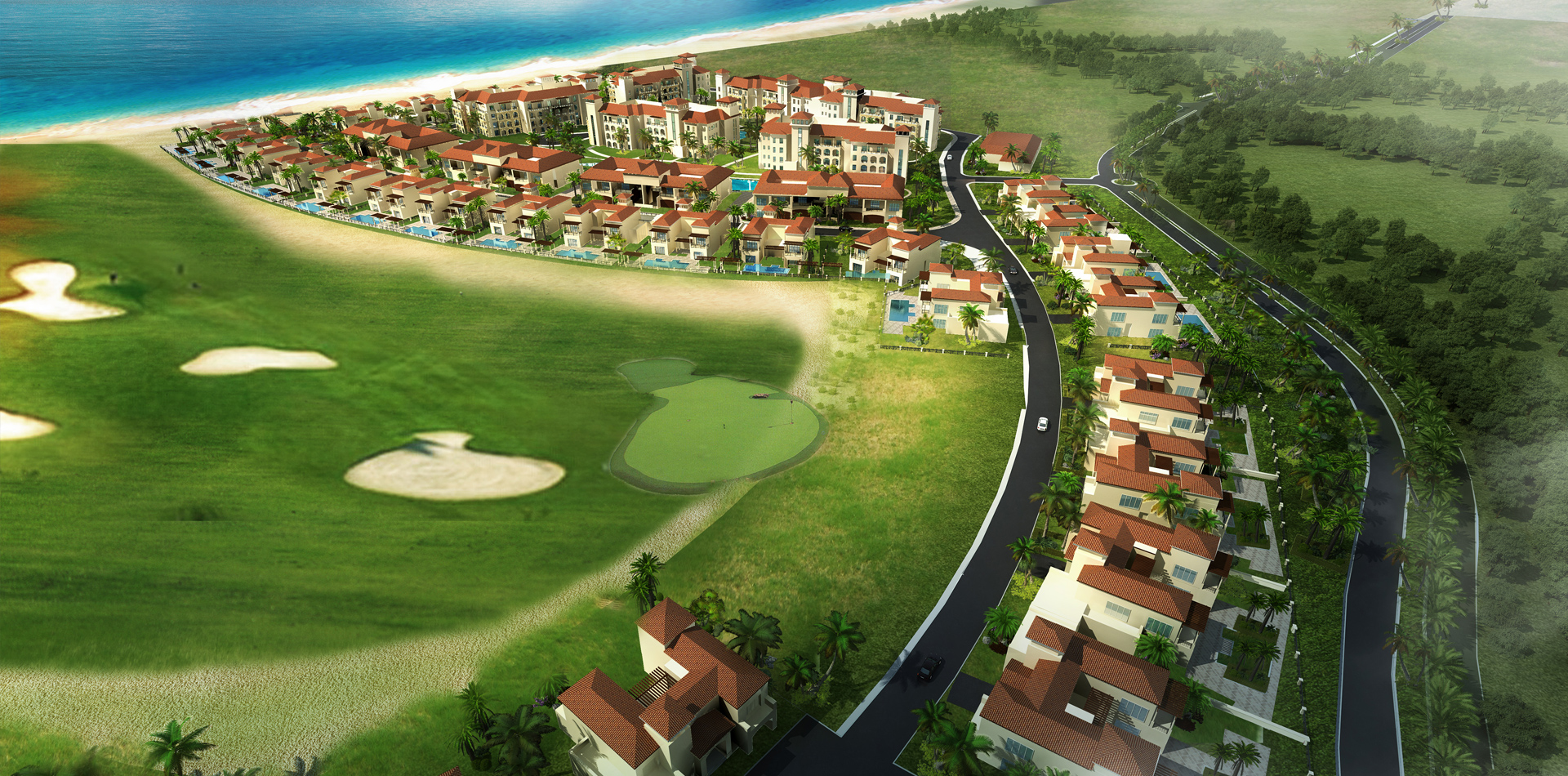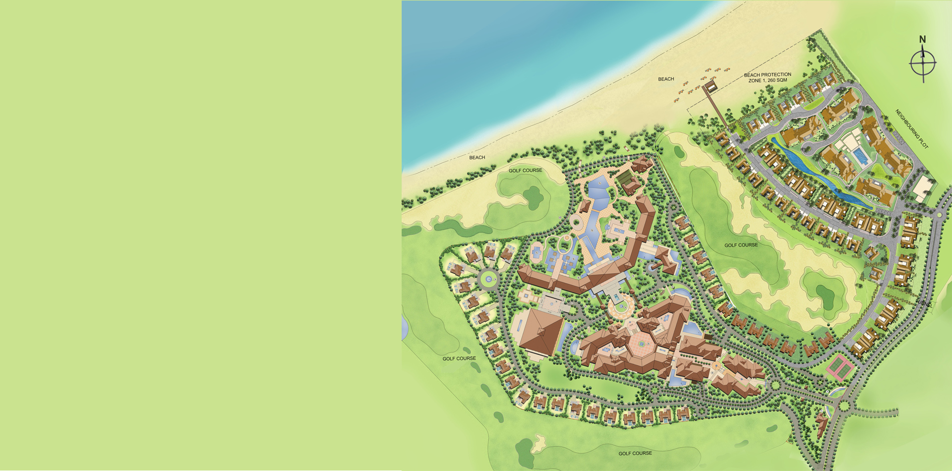 mix of high-end beachfront & golf course Villas, Townhouses, Serviced Apartments and a cosy Boutique Hotel. Lush landscapes with pool & club facilities and direct access to the golf course and private beach adds extra value to the Development.